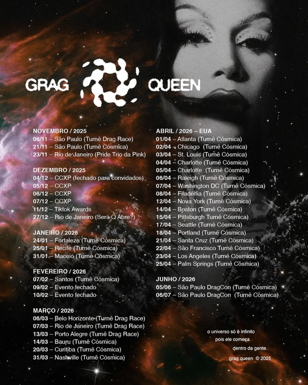 Grag Queen anunciou sua aguardada turnê 'Cósmica', que vai levar a artista do Sul ao Nordeste do Brasil, percorrendo em diversas cidades, e também com apresentações nos Estados Unidos, em 2026.