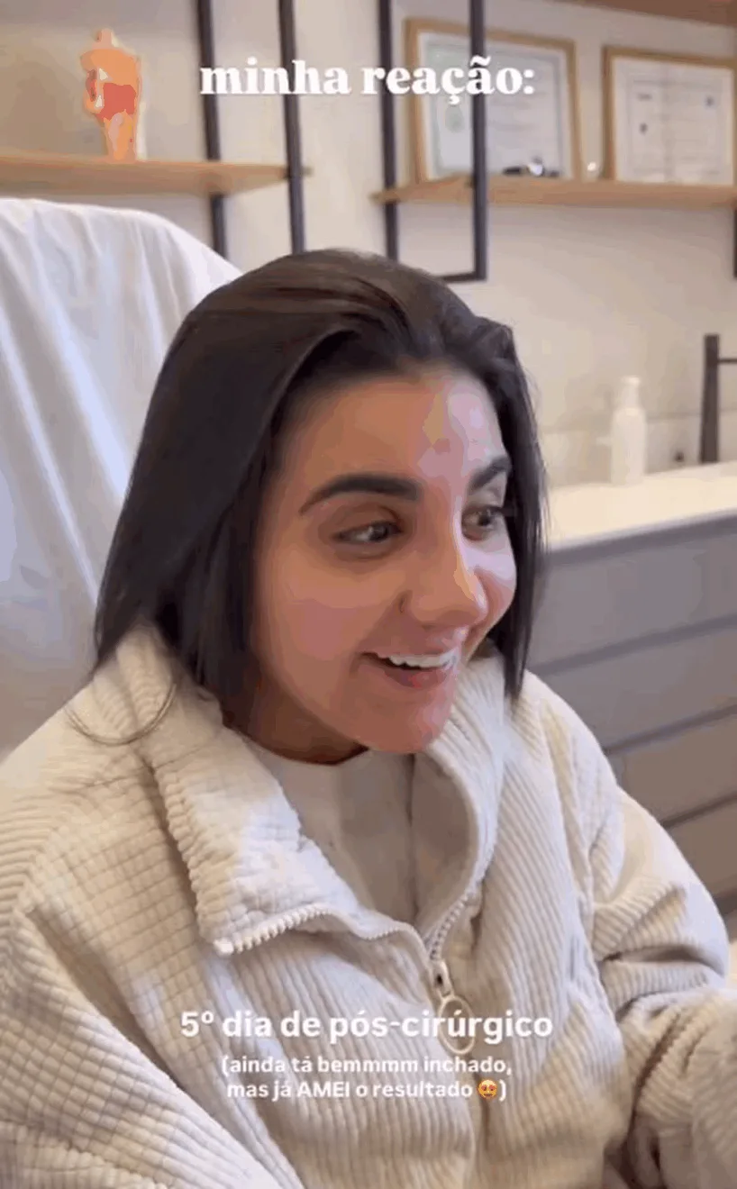 Através dos Stories do Instagram, a cantora sertaneja postou um vídeo mostrando sua reação ao ver como ficou seu rosto após a cirurgia plástica. "Quinto dia de pós-cirúrgico. Ainda está bem inchado, mas já amei o resultado", escreveu ela.